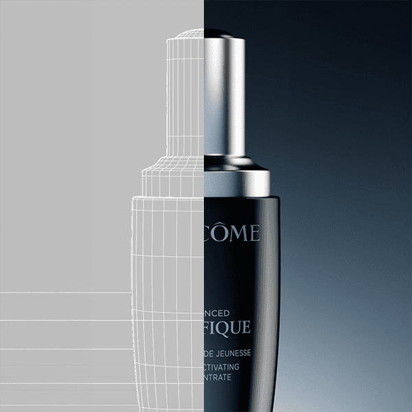 À partir de deux images de référence du sérum Advanced Génifique de Lancôme, on a recréé une modélisation 3D fidèle et élégante.